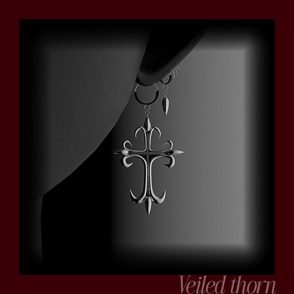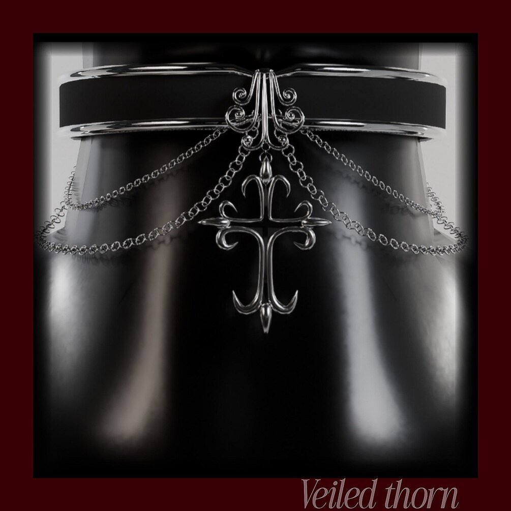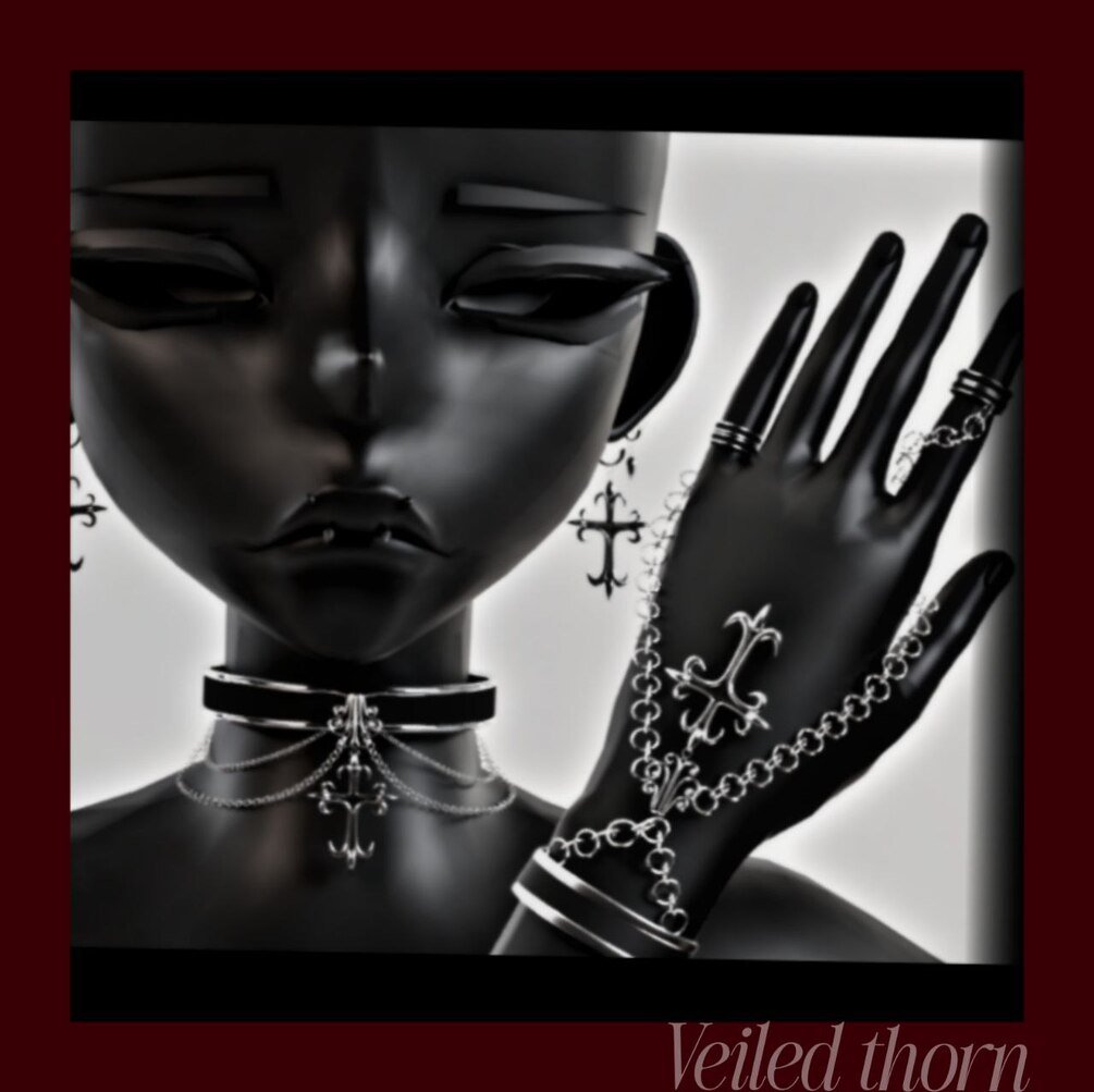 A complete gothic jewelry set for VRChat avatars featuring a striking cross motif. Includes matching choker, earrings, layered bracelets, and an elegant hand-chain for a dramatic, high-fashion statement in any virtual world.