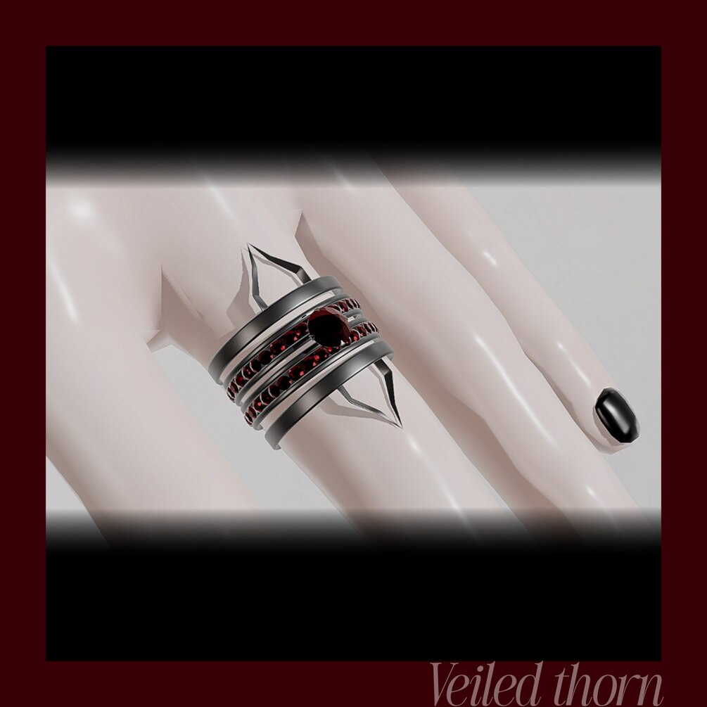 A striking red gemstone ring with layered metallic bands and a dramatic centerpiece, designed to feel ornamental and mystical rather than purely decorative vrchat asset.