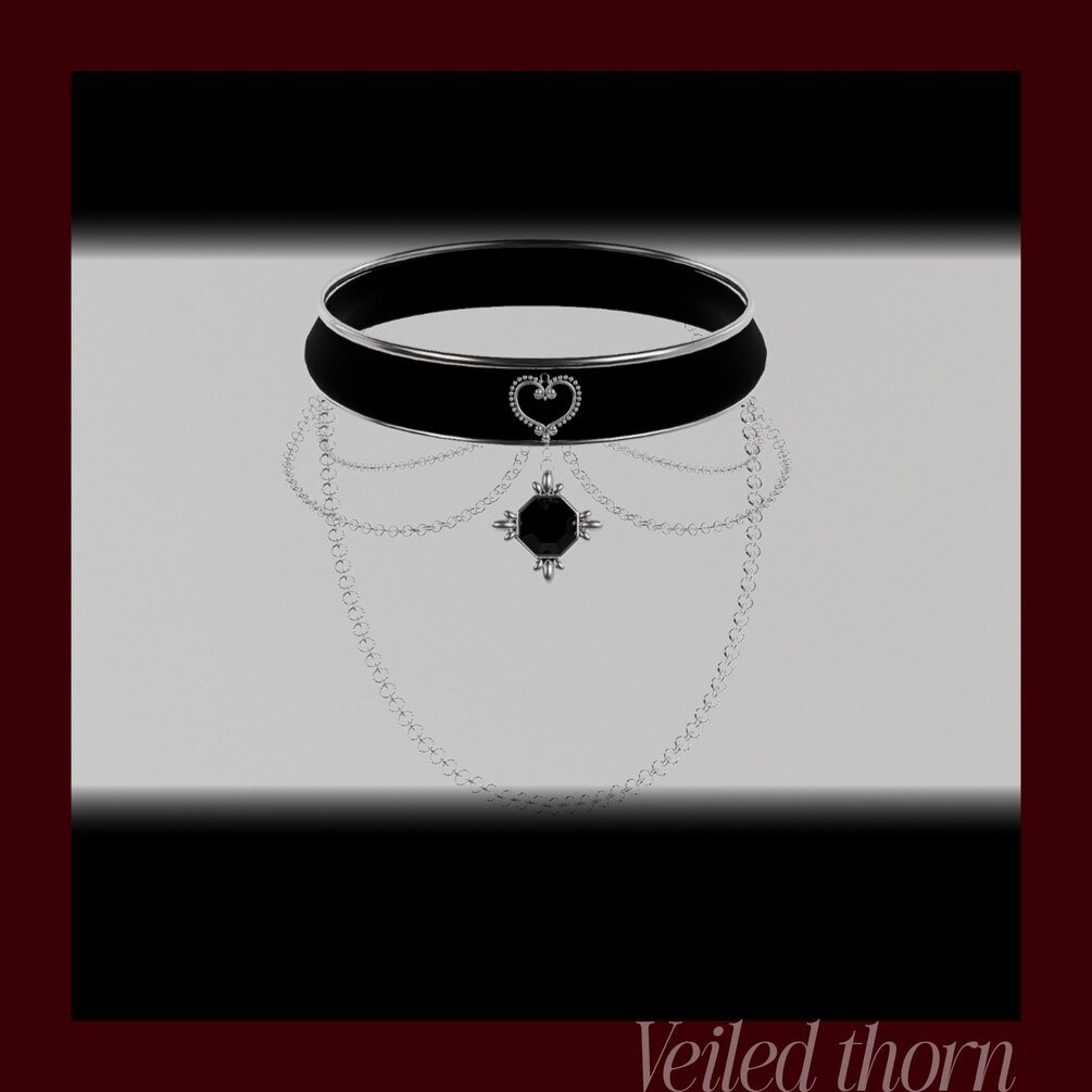 Dark, delicate, and effortlessly dramatic. This VRChat-ready choker pairs a sleek black band with layered silver chains and a jeweled heart pendant for a perfect gothic statement.
