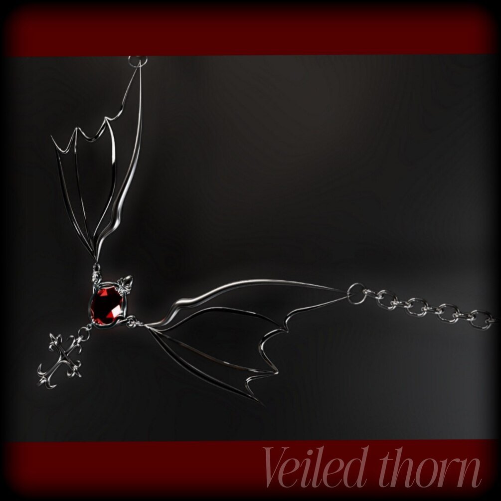 Unveil your dark elegance with Veiled Thorn, a gothic-inspired necklace designed for the bold and the mysterious. This unique piece features sleek, metallic bat wings delicately cradling a deep crimson gemstone at its heart. Below the gem hangs a refined, thorned cross — a symbol of hidden power and allure