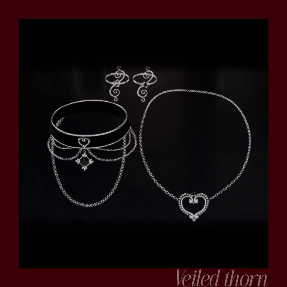 Elegant gothic-style 3D accessory set for VRChat, featuring a matching choker, rings, and necklace with delicate heart details. Fully customizable and perfect for avatars that need a dark yet romantic touch.